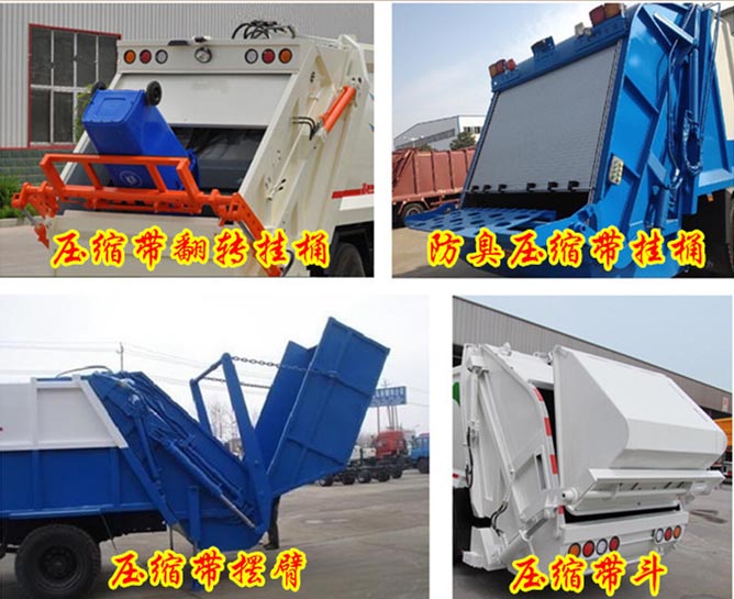 Body configuration: New rib-free box, beautiful and generous plane arc, effective compression volume of 4 cubic meters, flipping loading mechanism at the tail, electronically controlled manual dual control system, dual control boxes in the cab and the rear of the car, with a 3 cm rear belt at the rear Rubber sealing strip, with sewage collection tank, large-capacity sewage tank, the box can be spray-painted with patterns and words as required.
