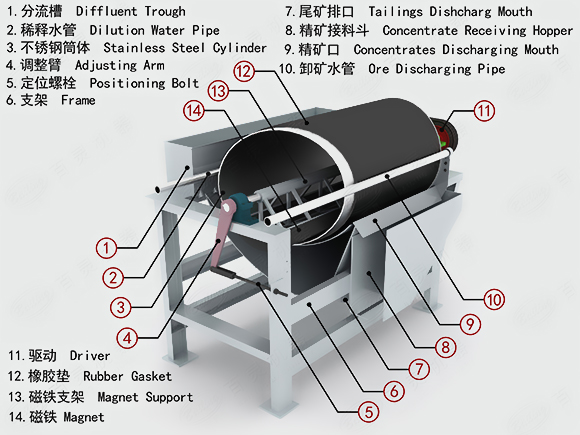 1:筒體,2:磁系,3:槽體,4:磁導(dǎo)板,5:支架,6:噴水管,7:給礦箱,8:卸礦水管,9:底板,10:磁偏角調(diào)整裝置,11:支架。