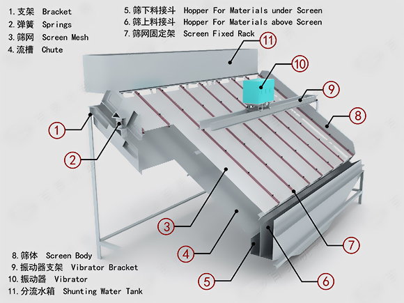 設(shè)備安裝角度方便可調(diào),根據(jù)所需礦物粒度調(diào)整篩面傾角,傾角接近55°時(shí),細(xì)度可達(dá)300目, 篩分效率可達(dá)70%以上。在作業(yè)過程中,靈活方便,生產(chǎn)效率高。